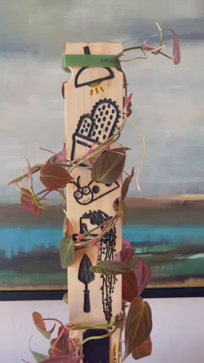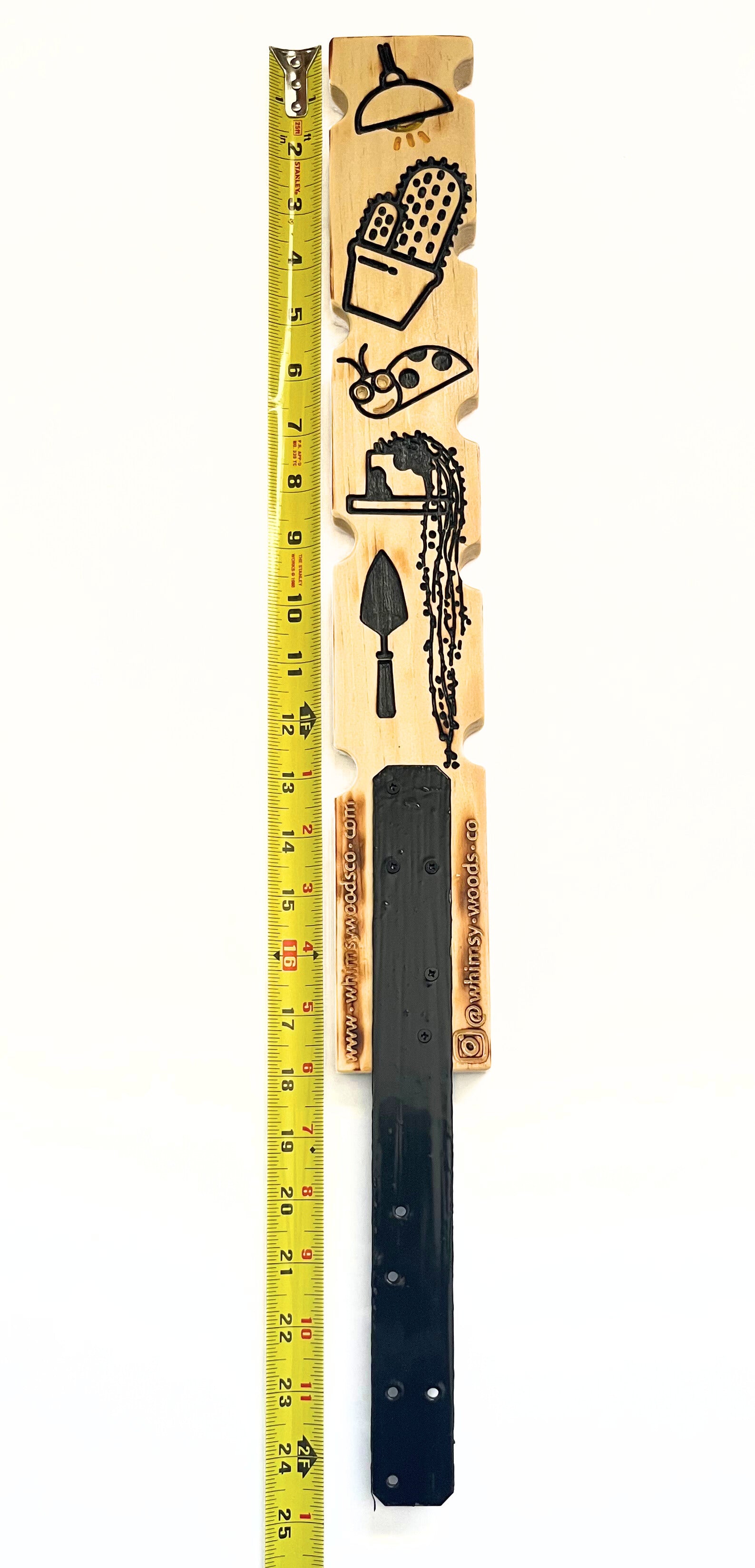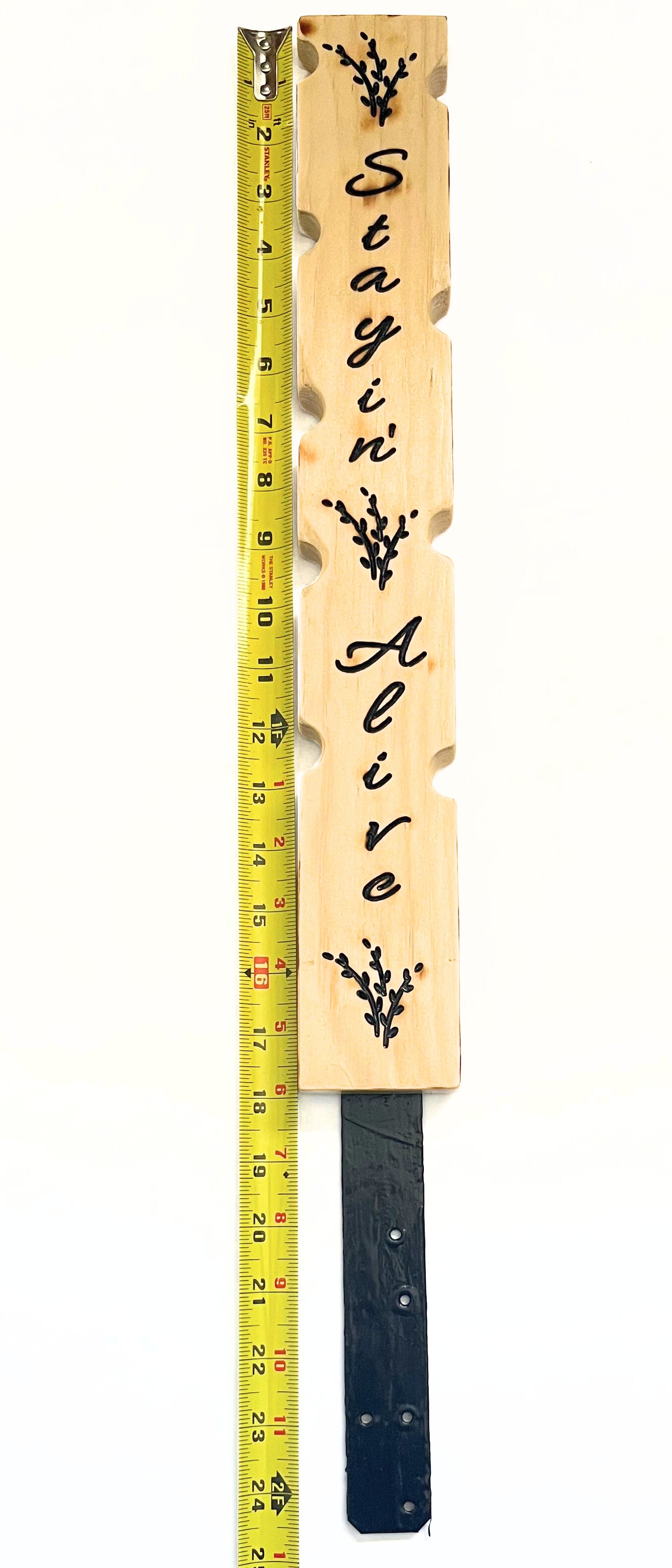 On one side, you’ll find the engraved message “Stayin’ Alive” in flowing script with subtle botanical accents — a nod to your plant’s will to survive (and your effort to keep it that way). Flip it over for a collection of fun plant-care icons — from watering cans to gardening tools — etched into warm pine wood for added charm.